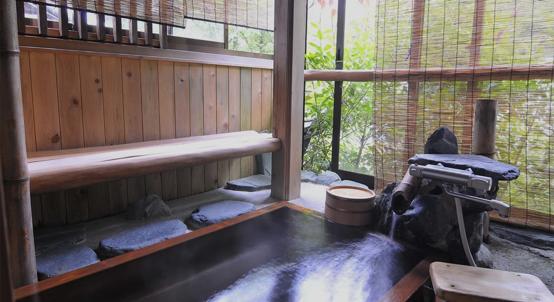 静かな時の流れを感じながら古代檜の湯船につかり、ゆったりとした時を過ごせるお部屋です。丸窓から差し込む日の光は日々の喧騒につかれた私たちを柔らかに包み込んでくれます。